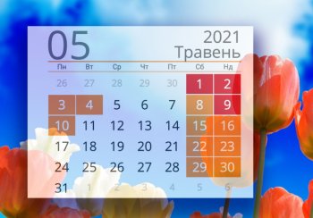 03 травня 2021 року (понеділок), 04 травня 2021 року (вівторок) та 10 травня 2021 року (понеділок) – вихідні дні!